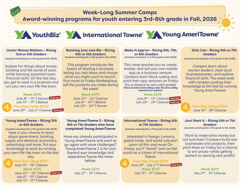 Summer day camps are a great way for young people to experience financial education through our award-winning programs facilitated by our beloved program staff! These dynamic camps (which emphasize fun!) feature interactive activities, hands-on application of instruction as well as outdoor time on our beautiful program deck. Camps are available for youth entering 3rd-8th grade in the 2026-2027 school year.